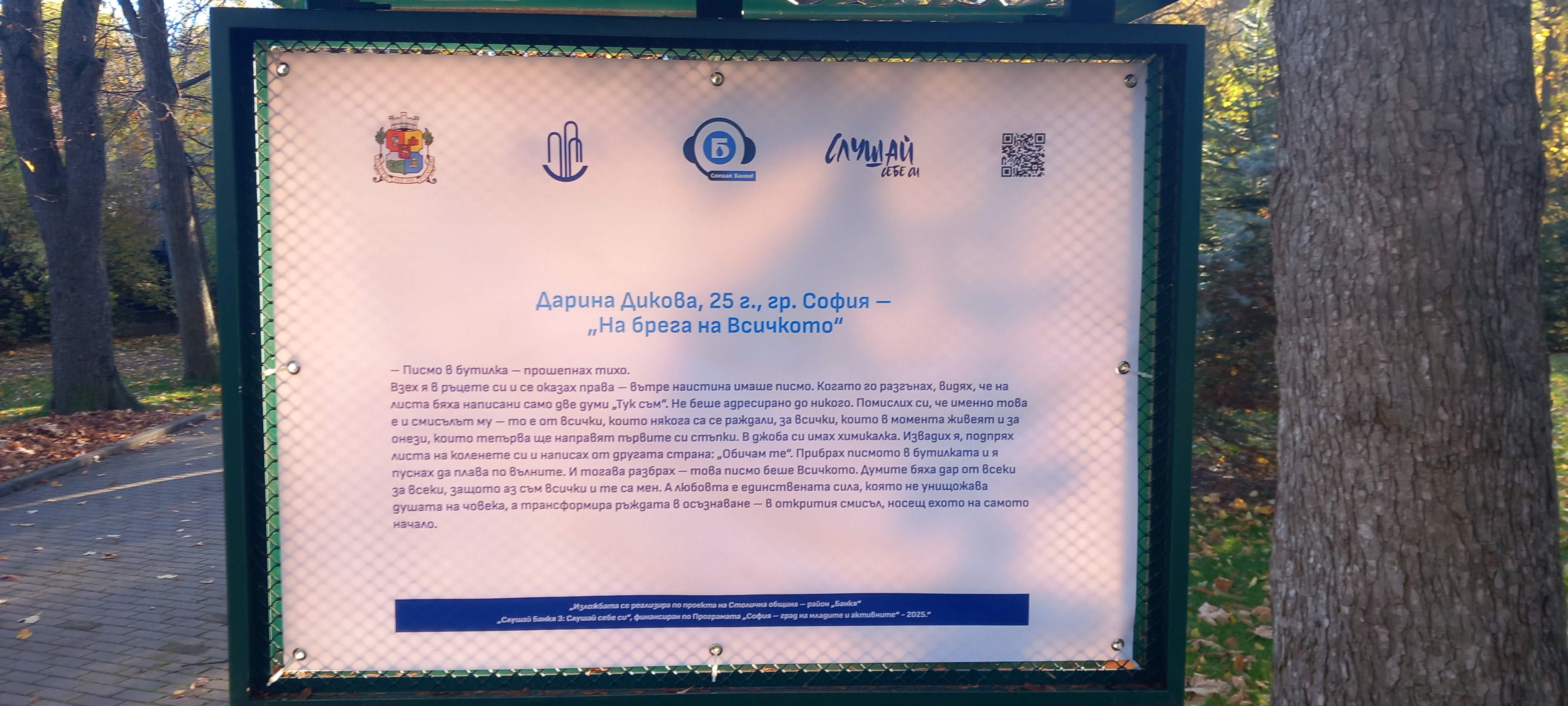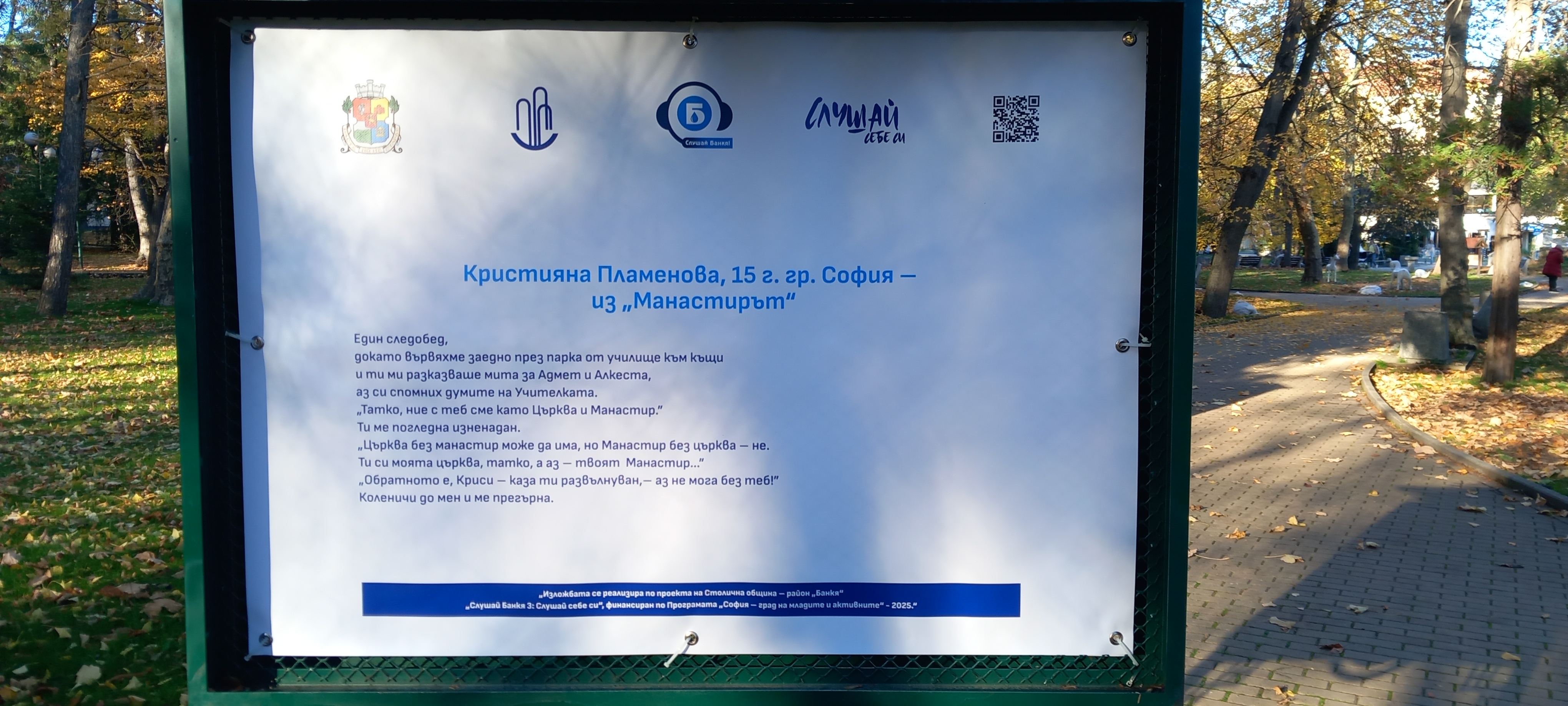 На 29 октомври район „Банкя“ откри изложбата „Слушай себе си“ в парк „Кестените“. Експозицията включва 30 визуализации с текст и илюстрации, разположени в Галерията на открито. През следващите месеци жителите и гостите на Банкя ще се насладят на произведения, създадени за Младежкия литературен конкурс „Слушай себе си“, както и илюстрации от млади художници от града.